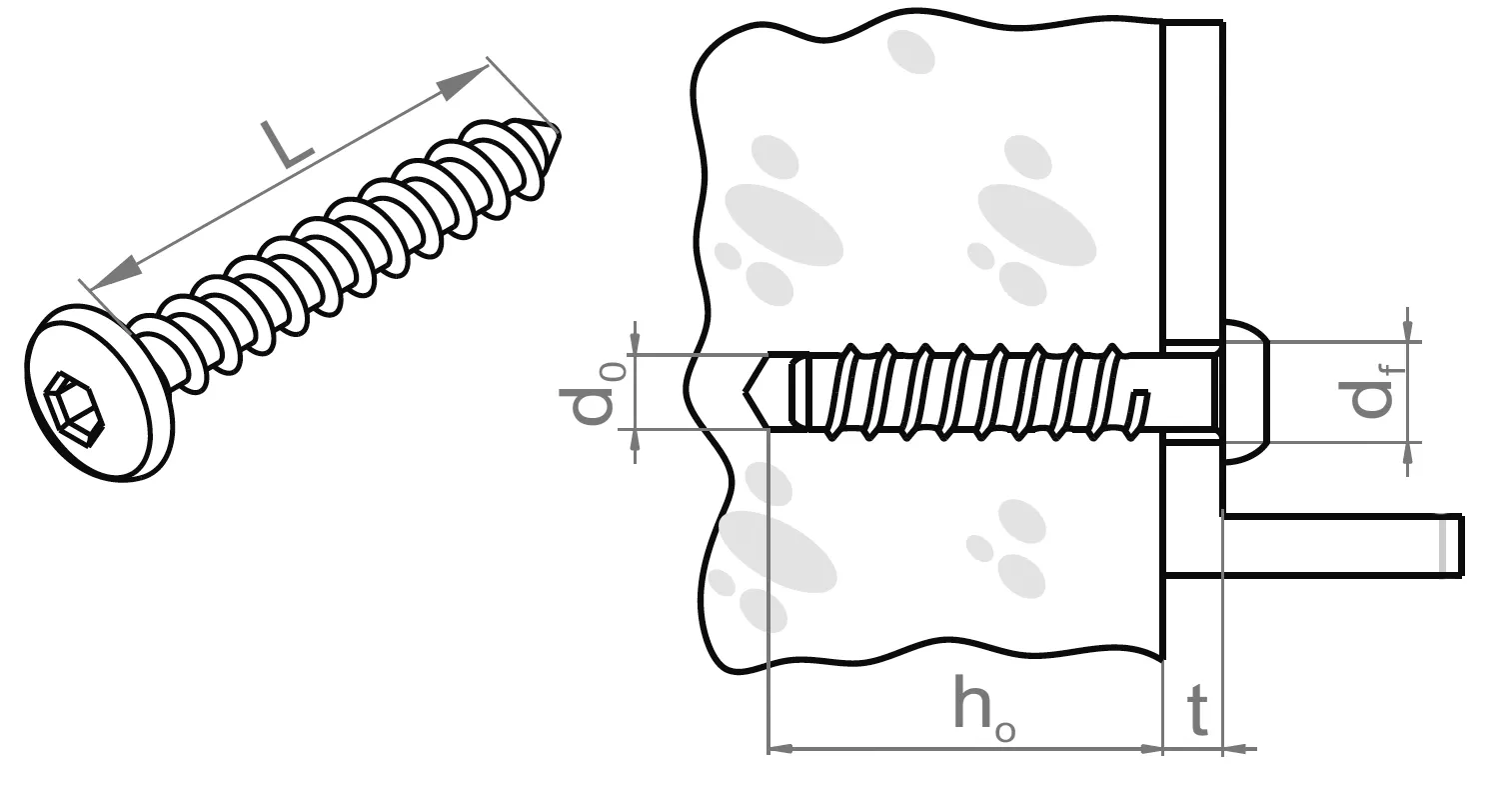 Монтажна конструкція, підвішування кабельних трас до бетонної основи. Матеріал G - оцинкований Додаткова інформація – d0 – діаметр свердла – d1 - отвір у закріпленому елементі – h0 - мін. глибина свердління – t – максимальна корисна товщина