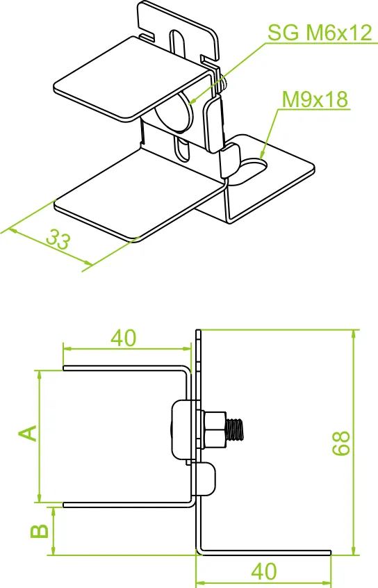 Вирівнювання коробів на нерівній поверхні. Матеріал S - Сталь, оцинкована методом Сендзіміра PN-EN 10346:2015-09 Доступні варіанти оздоблення: E - нержавіюча сталь Додаткова інформація – Діапазон регулювання A/B: 28/52, 38/46, 48/35