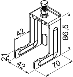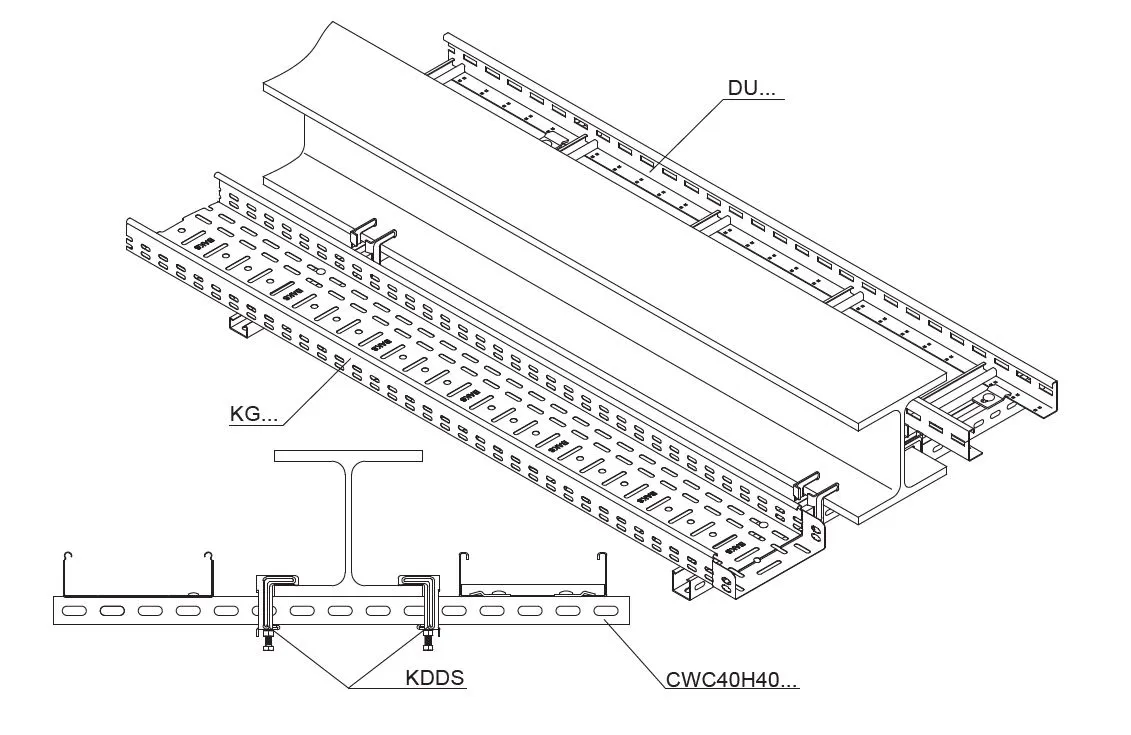Підвішування кабельних трас. Матеріал S - Сталь, оцинкована методом Сендзіміра PN-EN 10346:2015-09 Доступні варіанти оздоблення: FP - оцинкований методом цинкової стружки PN-EN ISO 10683:2018-11 E - нержавіюча сталь L - фарбування у стандартний колір RAL Додаткова інформація – кріплення до двотаврової балки за допомогою комплекту кронштейнів, що складається з 2 кронштейнів KDDS та профілю CWC40H40