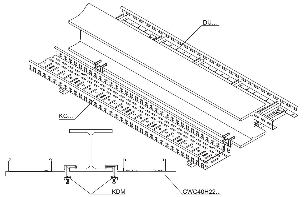 Підвішування кабельних трас. Матеріал S - Сталь, оцинкована методом Сендзіміра PN-EN 10346:2015-09 Доступні варіанти оздоблення: FP - оцинкований методом цинкової стружки PN-EN ISO 10683:2018-11 E - нержавіюча сталь L - фарбування у стандартний колір RAL Додаткова інформація – кріплення до двотаврової балки за допомогою комплекту кронштейнів, що складається з 2 кронштейнів KDM та профілю CWC40H22