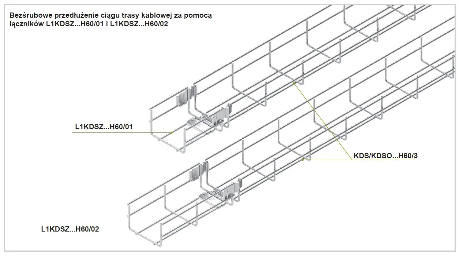 Безгвинтове подовження кабельної траси. Матеріал G - оцинкований Доступні варіанти оздоблення: F - гарячеоцинкована сталь PN-EN ISO 1461:2023-02 L - фарбування у стандартний колір RAL