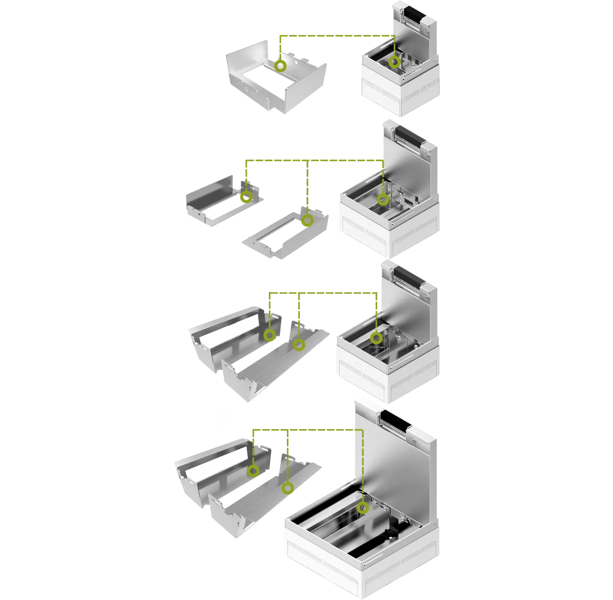 Комплектна підлогова коробка, готова до монтажу в інженерних підлогах, фальшпідлогах та бетонних стяжках. Коробка з оцинкованими та нержавіючими сталевими компонентами готова до використання у вологих середовищах.