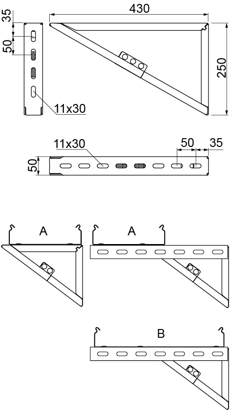 – настінний кронштейн призначений для зазначеної ширини кабельної траси (A)