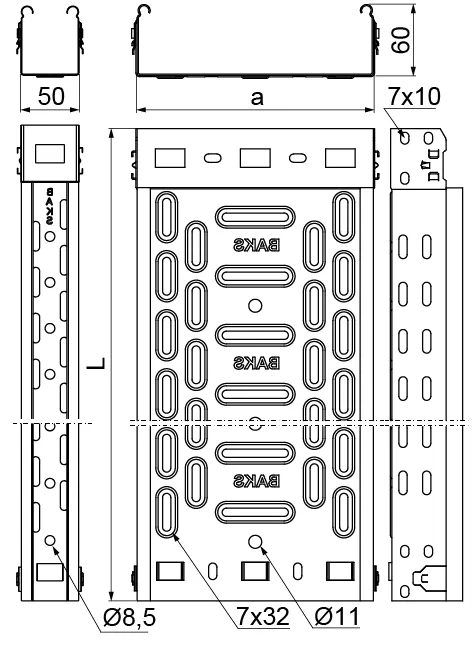 - Прорізні отвори Ø11 в дні кабельного лотка дозволяють підвішувати