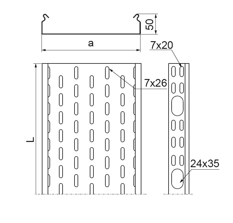 Секції кабельного лотка можна з'єднувати між собою тільки за допомогою з'єднувачів (відсутність вирізу у фланці на кінці бокового профілю).