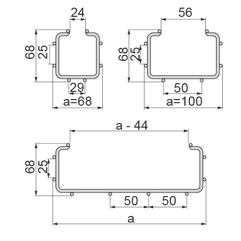 Маршрутизація кабелю. Матеріал G - оцинкований Доступні варіанти оздоблення: F - гарячеоцинкована сталь PN-EN ISO 1461:2023-02 E - нержавіюча сталь L - фарбування у стандартний колір RAL