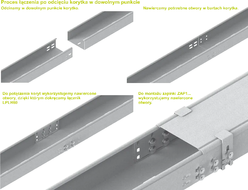 Система підтримки кабельних лотків без з'єднувачів. Додаткове з'єднання лотків шляхом вставки одного лотка в інший та закручування гвинтами. Ми рекомендуємо використовувати з'єднувачі лише при великих навантаженнях.