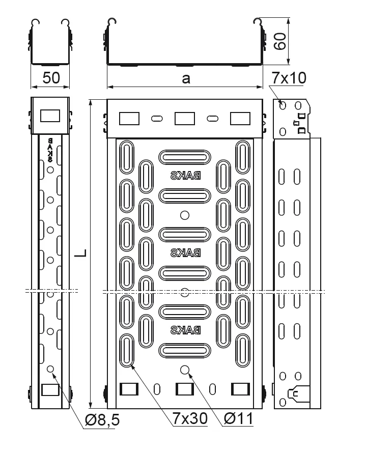 – Ø8.5 отворів шириною до 50 мм і Ø11 шириною від 100 мм в нижній частині лотка дозволяють підвішувати його на одному різьбовому стрижні (максимальна ширина підвішеного таким чином лотка 200 мм)