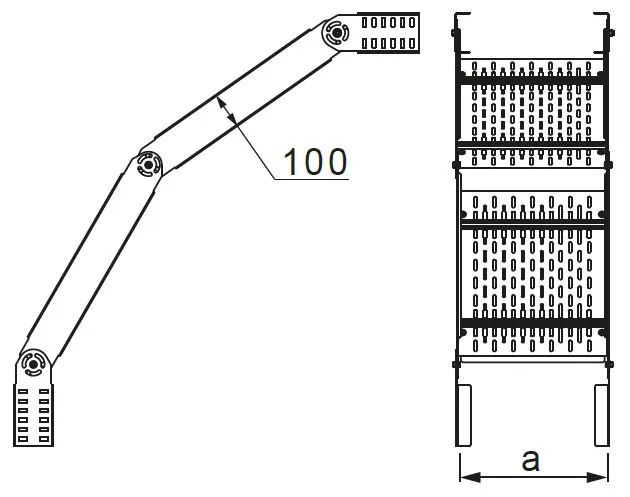 Відхилення під час прокладання кабелю. Повне регулювання кута з фіксацією Матеріал S - Сталь, оцинкована методом Сендзіміра PN-EN 10346:2015-09 Доступні варіанти оздоблення: F - гарячеоцинкована сталь PN-EN ISO 1461:2023-02 E - нержавіюча сталь L - фарбування у стандартний колір RAL