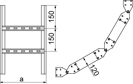 Зміна напрямку кабельної траси. Матеріал S - Сталь, оцинкована методом Сендзіміра PN-EN 10346:2015-09 Доступні варіанти оздоблення: F - гарячеоцинкована сталь PN-EN ISO 1461:2023-02 E - нержавіюча сталь L - фарбування у стандартний колір RAL Додаткова інформація – для кріплення використовуйте 16 комплектів болтів SGKM8x14 або SGM8x14