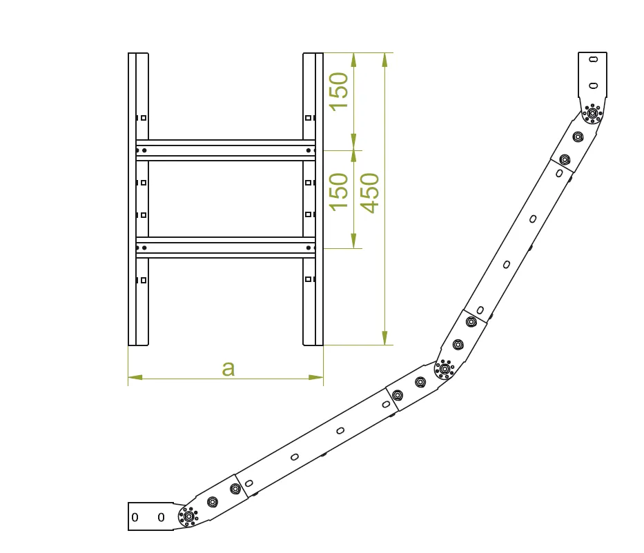 Зміна напрямку кабельної траси. Матеріал S - Сталь, оцинкована методом Сендзіміра PN-EN 10346:2015-09 Доступні варіанти оздоблення: F - гарячеоцинкована сталь PN-EN ISO 1461:2023-02 E - нержавіюча сталь L - фарбування у стандартний колір RAL Додаткова інформація – для кріплення використовуйте 8 комплектів болтів SGKM8x14 або SGM8x14