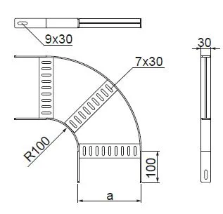 Зміна напрямку кабельної траси. Матеріал F - гарячеоцинкована сталь PN-EN ISO 1461:2023-02 Доступні варіанти оздоблення: E - нержавіюча сталь Додаткова інформація – використовуйте з'єднувачі LDOUH30 та болти SGKFM8x16 для кріплення