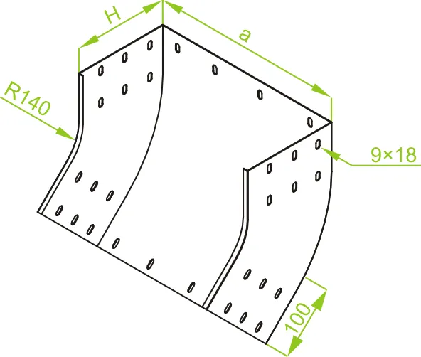 Зміна напрямку кабельної траси. Матеріал F - гарячеоцинкована сталь PN-EN ISO 1461:2023-02 Доступні варіанти оздоблення: E - нержавіюча сталь L - фарбування у стандартний колір RAL Додаткова інформація – для підключення фітинга до лотка використовуйте з'єднувач LCC... або комплект з'єднувачів LZC... та болти SGKFM8x14 або SGFM8x14