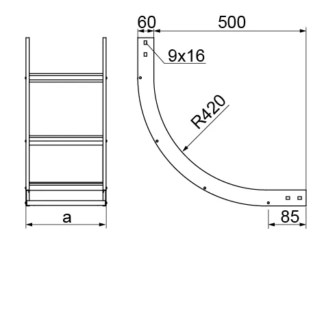 Зміна напрямку кабельної траси. Матеріал S - Сталь, оцинкована методом Сендзіміра PN-EN 10346:2015-09 Доступні варіанти оздоблення: F - гарячеоцинкована сталь PN-EN ISO 1461:2023-02 E - нержавіюча сталь L - фарбування у стандартний колір RAL Додаткова інформація – використовуйте 4 болти LDPH60 або LDC/LDOCH60 та 16 комплектів болтів SGKM8x14 або SGM8x14 для кріплення