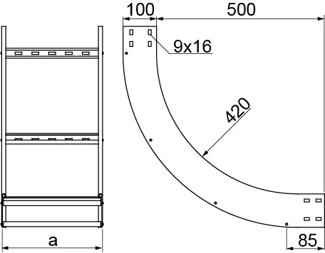 Зміна напрямку кабельної траси. Матеріал S - Сталь, оцинкована методом Сендзіміра PN-EN 10346:2015-09 Доступні варіанти оздоблення: F - гарячеоцинкована сталь PN-EN ISO 1461:2023-02 E - нержавіюча сталь L - фарбування у стандартний колір RAL Додаткова інформація – для кріплення використовуйте 4 з’єднувачі LDPH... або LDCH... та 32 комплекти болтів SGKM8x14 або SGM8x14