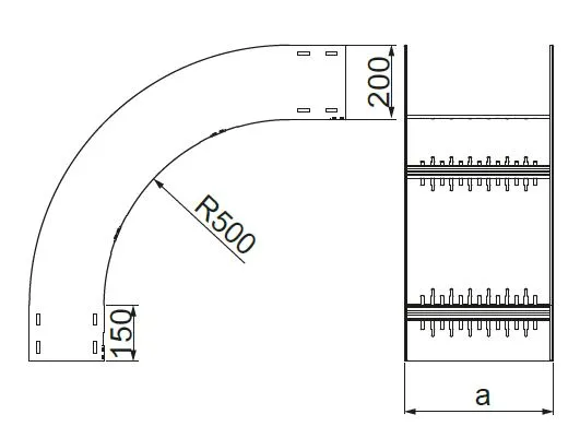 Зміна напрямку кабельної траси. Матеріал S - Сталь, оцинкована методом Сендзіміра PN-EN 10346:2015-09 Доступні варіанти оздоблення: F - гарячеоцинкована сталь PN-EN ISO 1461:2023-02 E - нержавіюча сталь L - фарбування у стандартний колір RAL Додаткова інформація – для з’єднання фітинга з лотком необхідно використовувати з’єднувачі фітингів LSSU... та болти SGKM8x16