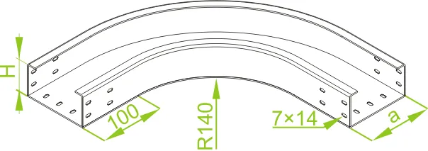 Зміна напрямку кабельної траси. Матеріал F - гарячеоцинкована сталь PN-EN ISO 1461:2023-02 Доступні варіанти оздоблення: E - нержавіюча сталь L - фарбування у стандартний колір RAL Додаткова інформація – для підключення фітинга до лотка використовуйте з'єднувач LCC... або комплект з'єднувачів LZC... та болти SGKFM6x12 або SGFM6x12