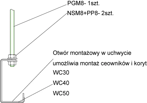Підвішування кабельних лотків та каналів. Матеріал S - Сталь, оцинкована методом Сендзіміра PN-EN 10346:2015-09 Доступні варіанти оздоблення: FP - оцинкований методом цинкової стружки PN-EN ISO 10683:2018-11 E - нержавіюча сталь L - фарбування у стандартний колір RAL